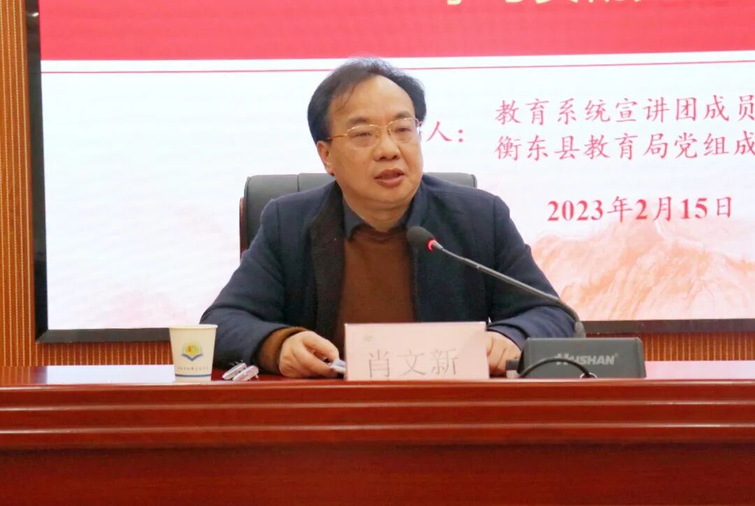 为深入学习宣传贯彻党的二十大精神,推动党的二十大精神在基层走深走实,2月15日,衡郡高级中学召开学习宣传贯彻党的二十大精神宣讲会。县教育系统宣讲团成员、县教育局党组成员、副局长肖文新作宣讲报告。
