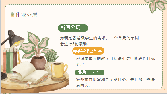 由于A类学习小组,由于学生的学习能力相对较强,老师要布置相对难一点的任务,对于B类小组,可以稍微容易一点。通过布置不同层次的任务,最终让所有学生都能过关,达到共同进步的目的。